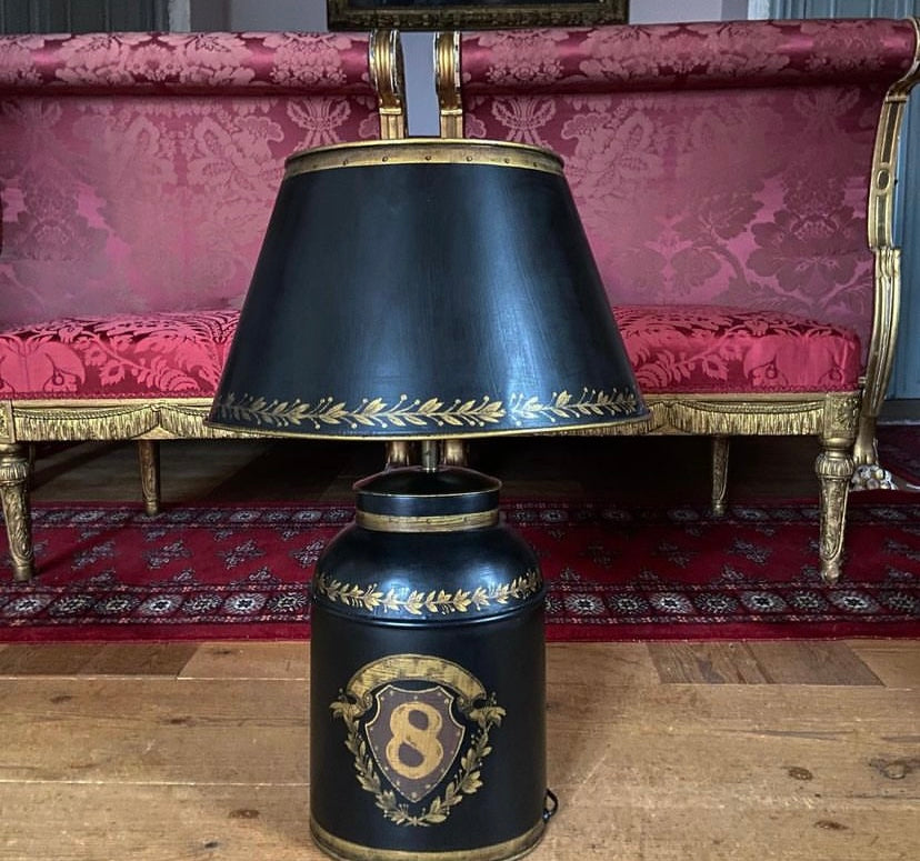 Läcker lampa i svart plåt med gulddetaljer och handmålad skärm. Skärm ingår.